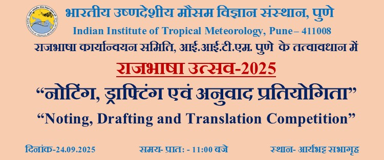 | 4. | नोटिंग, ड्राफ्टिंग एवं अनुवाद प्रतियोगिता Noting, Drafting and Translation Competition | 24.09.2025 | आर्यभट्ट सभागृह | प्रातः 11:00 बजे |