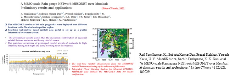 Sunilkumar, K., Subrata Kumar Das, Prasad Kalekar, Yogesh Kolte, U. V. MuraliKrishna, Sachin Deshpande, K. K. Dani et al. "A MESO-scale Rain gauge NETwork-MESONET over Mumbai: Preliminary results and applications." Urban Climate 41 (2022): 101029.