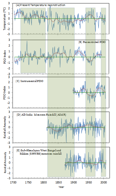 A 437-year Tsuga dumosa (D.Don) Eichler (i.e., Himalayan hemlock) tree-ring chronology for northern Sikkim and a subsequent summer (JAS) temperature reconstruction during the past 304 years is presented. Dendroclimatic analysis indicates a strong negative relationship between late-summer mean temperatures (July-August-September; JAS) and tree growth. This relationship enables us to reconstruct the JAS mean temperature over northern Sikkim since 1705 C.E. The 304-year (1705-2008 C.E.) reconstructed temperature series shows similar warm and cool epochs, which have been observed in many other temperature reconstructions in the region and other proxy records of glacial fluctuations. An overall steady decreasing trend in the regional surface temperature is observed since 1705 C.E., while an increasing trend with intermittent, short and cool epochs are noticed from 1850 C.E. to the present. Global teleconnections of the reconstructed temperature variations indicate the important roles of the Pacific Decadal Oscillation (PDO), El Niñouthern Oscillation (ENSO), and volcanic eruptions as drivers of temperature variations in the Sikkim region of the Himalayas.